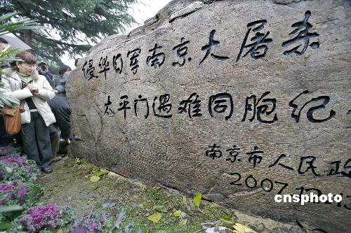 12月12日上午,侵華日軍南京大屠殺太平門遇難同胞紀念碑揭碑。這是南京市在全市建立的第19座南京大屠殺遇難同胞叢葬地紀念碑。南京市相關部門領導、日本“銘心會”訪華團團長松岡環女士及全體團員、旅日華僑中日友好促進會秘書長林伯耀先生以及群眾代表、中外媒體等參加了揭碑儀式。中新社發 祁恩芝 攝