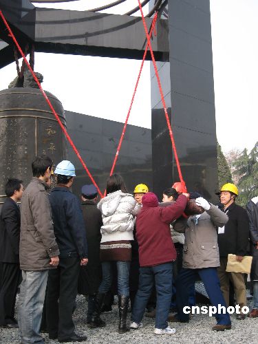 十二月十三日十時(shí),江蘇省各界人士八千多人在新落成的侵華日軍南京大屠殺遇難同胞紀(jì)念館新館前的和平廣場(chǎng)隆重舉行“悼念侵華日軍南京大屠殺三十萬(wàn)同胞遇難七十周年暨侵華日軍南京大屠殺遇難同胞紀(jì)念館擴(kuò)建工程竣工儀式”。南京大屠殺幸存者代表、青少年代表、擴(kuò)建工程建設(shè)者代表放飛和平鴿,并撞響了“和平大鐘”。中新社發(fā) 朱曉穎 攝