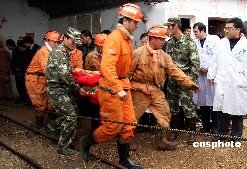 十二月十六日十三時五分,在地下被困一百一十四個小時后,安徽繁昌鐵礦事故六名受困礦工被成功救出。獲救的六名礦工被抬出礦井后,立即被等候在現場的救護車送到醫院急救中心,現在尚不能確定被救礦工是否脫離生命危險。目前還有一人下落不明,搜救工作仍在進行。中新社發 水從澤 攝