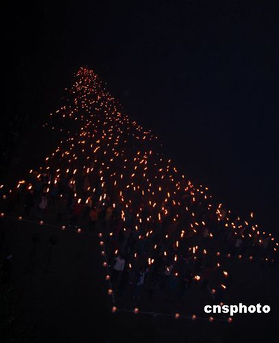 12月24日晚,2000名游客在長沙世界之窗高舉手中的火把,擺出圣誕樹隊(duì)形。據(jù)悉,如此巨型的“人體”圣誕樹在中國來說尚屬首創(chuàng)。中新社發(fā) 肖前輝 攝