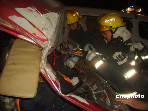 12月24日,山東棗莊發生一起兩車追尾事故。當地消防支隊特勤中隊接到報警后,派出12名消防官兵、一輛搶險救援車和一輛水罐車。經過近半個小時施救,2名被困人員成功獲救。中新社發 季龍 攝