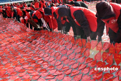 十二月二十九日,一個名為“共享健康·愛心接力”大型公益活動在北京奧體中心體育場和廣州奧體中心體育場同時展開。一千位來自中國各地的老人作為“愛心大使”,把載滿愛心故事的十萬顆小紅“心”貼成兩顆巨大的“愛心”,以沖擊吉尼斯世界紀錄。中新社發 黎仲顏 攝