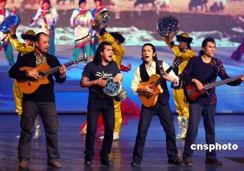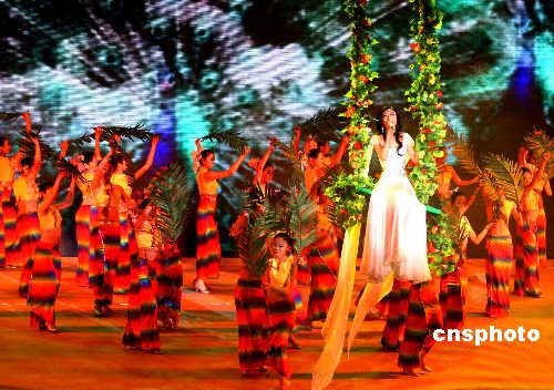 2007年12月31日晚,中國中央電視臺(tái)在北京舉辦2008年元旦雙語(漢語、英語)晚會(huì),中國及日本、韓國、泰國、馬來西亞、新加坡、印度等國家的藝術(shù)家同臺(tái)獻(xiàn)藝,歡度新年佳節(jié),他們以歌曲、舞蹈、雜技、魔術(shù)、服裝秀、戲曲等藝術(shù)形式,祝福各國人民愉快。中新社發(fā) 宋吉河 攝