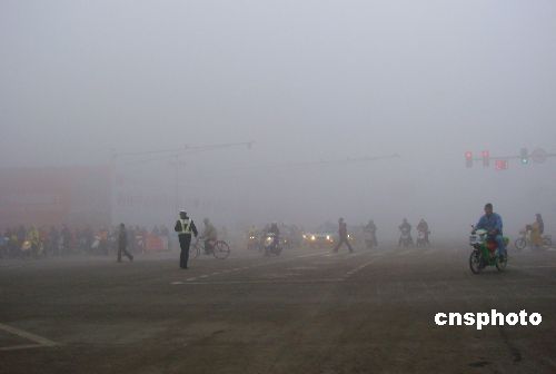 2008年1月7日,江蘇連云港遭遇大霧天氣,能見度不足50米,市民們謹慎出行。“三九”前夕,連云港最高溫度達到12℃,一直保持升高回暖的態勢,極易形成大霧天氣。中新社發 耿玉和 攝