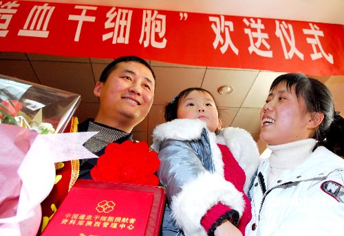 1月7日,造血干細(xì)胞捐獻(xiàn)者張文杰在歡送儀式上與妻女在一起。當(dāng)日,西安鐵路局西安供電段職工張文杰在中國造血干細(xì)胞捐獻(xiàn)者資料庫陜西管理中心工作人員的陪同下,前往西安唐都醫(yī)院捐獻(xiàn)造血干細(xì)胞,挽救一位素不相識的白血病患者的生命。據(jù)了解,張文杰是陜西省鐵路系統(tǒng)首位造血干細(xì)胞捐獻(xiàn)者。中新社發(fā) 唐振江 攝