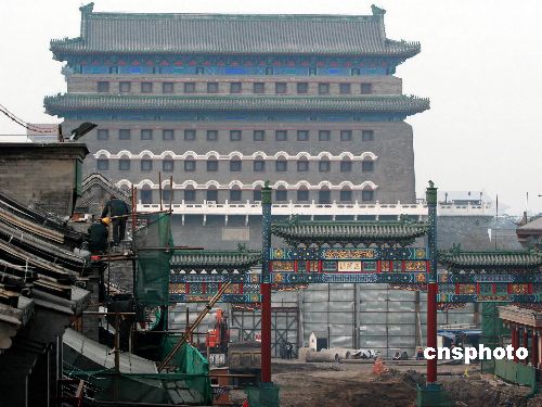 1月7日,北京前門步行街在寒冬中加緊施工。前門大街修繕整治后將恢復清末民初的建筑風貌,成為傳統與現代相結合的步行街。位于前門大街正陽門前的五牌樓已基本完工,亮出真容。中新社發 富田 攝
