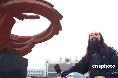 1月10日,創(chuàng)兩項(xiàng)吉尼斯世界紀(jì)錄——“殘疾人騎自行車穿越羅布泊之最”和“殘疾人騎自行車游中國(guó)之最”的殘疾人劉郁寶單車來到安徽巢湖市。他已行經(jīng)全國(guó)近千座城市,行程六萬公里。他此次來巢湖的目的是,宣傳祖國(guó)和平統(tǒng)一 ,呼吁全社會(huì)關(guān)心和支持殘疾人事業(yè),并為建立“中華史料庫”搜集史料。中新社發(fā) 張發(fā)平 攝