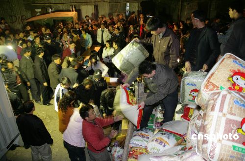 圖為一月十四日晚,惠州市為災(zāi)民發(fā)放慰問品現(xiàn)場(chǎng)。一月十三日上午,在廣東惠州市區(qū)河南岸街道辦事處河南岸村渡船頭村民小組面積過萬平方米的一片棚屋發(fā)生火災(zāi),造成三百多名來自河南、安徽等地的種菜和收廢品的外來民工受災(zāi)。火災(zāi)發(fā)生后,惠州市委、市政府和惠城區(qū)委、區(qū)政府以及河南岸辦事處立即妥善安置了災(zāi)民的生活。中新社發(fā) 宋秀杰 攝