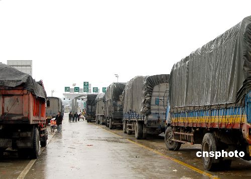 1月22日,在滬昆高速湖南邵陽懷化段洞口入口處,等待通行的車輛排起長龍。連日持續冰凍天氣,導致滬昆高速邵陽至懷化段的橋梁、涵洞全部冰凍,車輛無法通行,造成公路封閉。有關部門正采取措施,疏導滯留車輛。中新社發 滕治中 攝