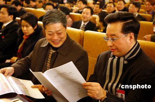 一月二十三日,政協上海市第十一屆一次會議開幕,香港房地產企業家屠海鳴(右)與上海恒源祥董事長劉瑞旗出席會議時進行交談。他們表示,將對上海的地產、交通、金融和文化等方面提出各自的建議。中新社發 潘索菲 攝