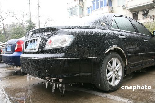 一月二十六日,江西四十二個(gè)縣市出現(xiàn)凍雨,是該省近二十年來(lái)遭遇的最嚴(yán)重凍雨(雨滴與地面或地物等接觸即凍結(jié)的雨)天氣。由于持續(xù)嚴(yán)寒,整個(gè)江西省儼然一個(gè)諾大的“滑冰場(chǎng)”,滿街跑的盡是“凍車族”。中新社發(fā) 吳慶才 攝