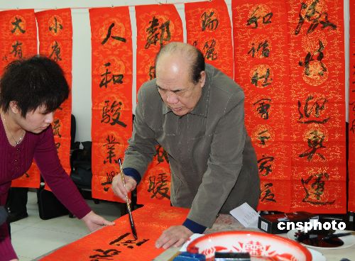 2月1日,中國(guó)書(shū)法家協(xié)會(huì)組織著名書(shū)法家二十余人到北京近郊農(nóng)村書(shū)寫(xiě)春聯(lián),把喜慶送到普通農(nóng)民家庭。中新社發(fā) 楊佐桓 攝