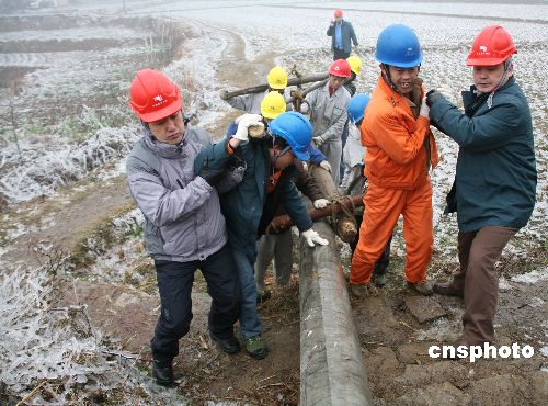 2月4日,貴陽市供電局金陽分局的工人頂風冒雪搶運野鴨鄉陽惠村農村電桿。貴陽市罕見的凝凍災害使野鴨鄉陽惠村和白云區麥格鄉的7根水泥電桿斷裂,造成1000多戶農家斷電10多天。鄉間小路大吊車進不去,工人們肩挑背扛將500多公斤的水泥電桿一根根運到施工現場,加班加點,確保在除夕之夜“萬家燈火”喜迎新春佳節。中新社發 pengnian 攝