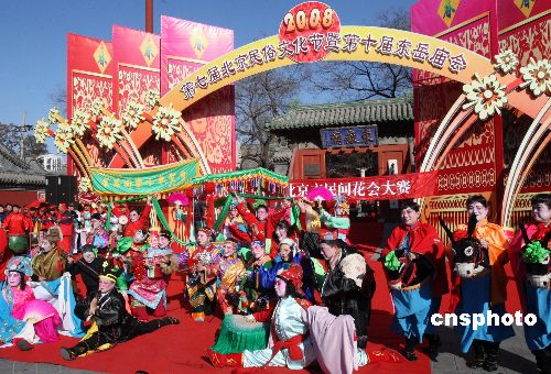 2月6日,“第七屆北京民俗文化節暨第十屆東岳廟春節文化廟會”在喜慶熱烈、歡樂祥和的氛圍中開鑼。東岳廟作為北京奧運會主場館所在地朝陽區唯一的民俗類專題博物館,是次廟會以“祈福納祥迎奧運”為主題,活動內容精彩紛呈,既有傳統的非物質文化遺產展示,亦有新增加的民俗活動“請福牌”、“畫福布”、“請五福”、“掛盤香”等活動。同時“東岳杯”朝陽區民間花會大賽的11個區縣、32檔花會也同臺競技。中新社發 錢興強 攝