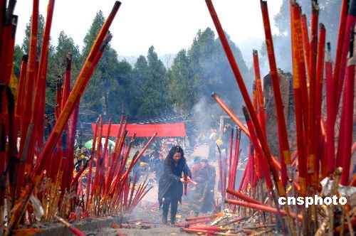 新春佳節四川民眾紛紛戶外登高,四川省南部縣火峰山寺廟前的山間小道上插滿了燃燒著的高香。中新社發 廖攀 攝