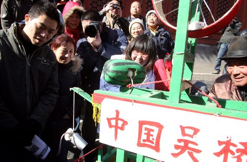 2月8日,中國農歷鼠年大年初二,北京一春節文化廟會上來自中國吳橋雜技之鄉的老藝人正在表演幽默的民間絕技訓白鼠。其白鼠的滑稽表演引來在場觀眾的陣陣笑聲。中新社發 張勤 攝