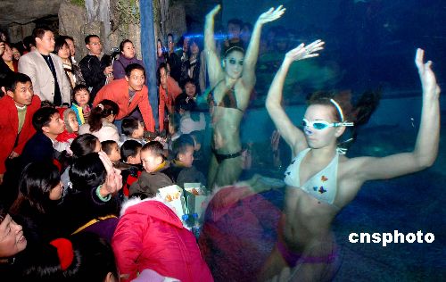 2月8日正月初二,來自俄羅斯遠東奧林匹克中心水下芭蕾表演隊的俄羅斯姑娘在福州一海底世界表演精彩水下芭蕾,令前來觀看的福州觀眾陶醉。中新社發 劉可耕 攝