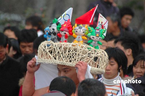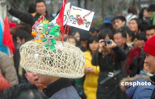 2月8日,一位頭頂“鳥巢”的市民出現(xiàn)在杭州公園,成為游人爭相追逐的“明星”。據(jù)悉,該帽是杭州市冬泳協(xié)會的杜仲明設(shè)計,請師傅用藤條做出的“鳥巢”,放上“五福娃”,特意為08新年冬泳“亮相”而裝扮。中新社發(fā) 引煒 攝
