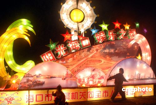 2008年2月7日晚,游人在“現代都市”燈前休閑觀賞。農歷大年初一,眾多市民和游客到海口萬綠園觀賞“華燈璀璨耀椰城”大型燈展。中新社發 善平 攝