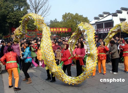 2月8日農歷大年初二,一支由蘇州古鎮同里農村婦女組成的舞龍表演隊在同里鎮退思廣場上表演,給節日的古鎮增添了濃濃的喜慶氣氛,吸引了眾多古鎮居民和中外游客觀看。中新社發 王建康 攝