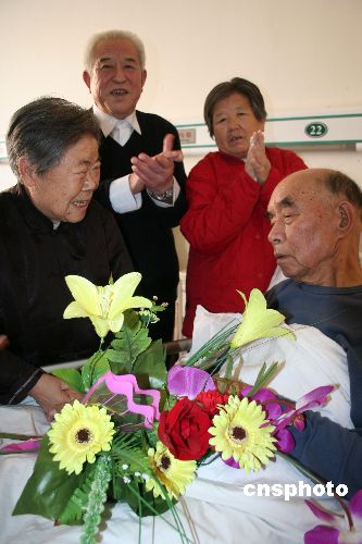 2月13日下午,在山東聊城光明眼科醫院老年護理中心,78歲的劉躍明(左一)向丈夫邊松獻上一束玫瑰,來紀念夫妻53年的風雨同舟。據了解,邊松于2008年1月,因患腦出血造成上指活動障礙。中新社發 孔政 攝