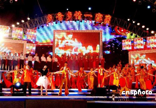 2月20日正月十四晚,前來參加“鄉音鄉情一家親”2008“兩馬同春鬧元宵”大型焰火文藝晚會演出的馬尾合唱團、馬尾大頭娃娃表演隊與馬祖合唱團、馬祖電音孩仔演出隊的成員共同上演開場歌舞《今宵多美好》。“兩馬同春鬧元宵”活動已經成功舉辦五屆。中新社發 劉可耕 攝