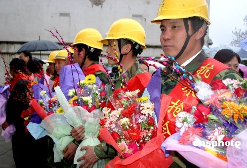 2月25日,江西贛東北供電公司50余名電力隊員,完成井岡山抗冰雪搶修任務后,從井岡山回到樂平。當日,千余名贛東北供電領導、搶修隊員家屬和樂平群眾冒雨相迎。中新社發 王國紅 攝