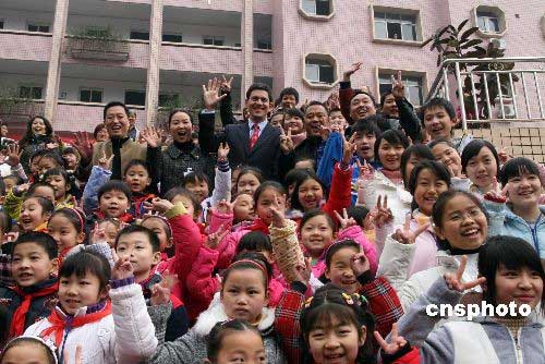 圖:英外交大臣與重慶農(nóng)民工子女合影留念