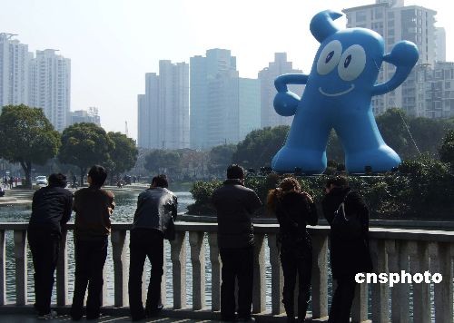 上海世博會(huì)吉祥物“海寶”現(xiàn)身新天地以來(lái),吸引了許多中外游客。2月28日,聳立在太平湖面上的大個(gè)子海寶,成為城市一景。中新社發(fā) 蔣振雄