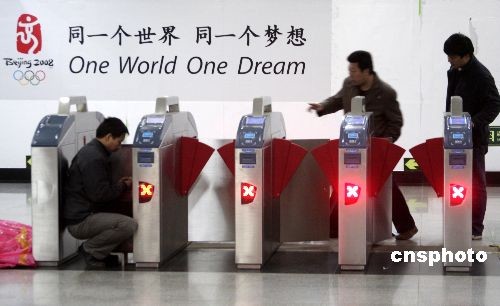 3月3日,工作人員在調試北京地鐵1號線天安門東站的自動檢售票系統。隨著奧運會臨近,北京地鐵1、2號線的新設備配套系統正在加緊調試,以便服務奧運會的正常使用。據工作人員介紹,地鐵車站安裝的新設備是自動檢售票系統,出入口處的是閘機,其相應的配套設備還有自動售票和充值機。目前5號線已全線調試完畢,但還需時間對地鐵1、2、13號線進行調試,預計6月后,北京地鐵線路都要開通和使用自動檢售票系統。中新社發 吳芒子 攝