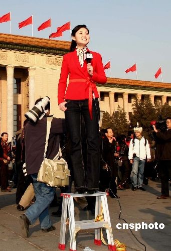 三月五日上午九時,十一屆全國人大一次會議在北京人民大會堂隆重開幕,一名女記者在大會堂前登梯進行新聞報道。中新社發 盛佳鵬 攝
