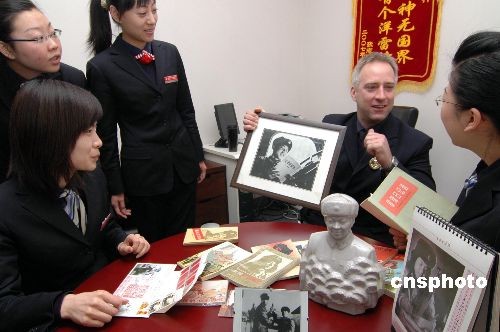3月5日,“洋雷鋒”羅杰斯在“外國(guó)人學(xué)雷鋒我們?cè)趺崔k?”活動(dòng)中展示自己收藏品。遼寧省錦州市商業(yè)銀行凌云支行外籍員工、美國(guó)人羅杰斯不但崇拜雷鋒,而且對(duì)學(xué)雷鋒情有獨(dú)鐘,收藏?cái)?shù)百件有關(guān)雷鋒的物品,而且翻譯了雷鋒日記。他在工作、生活中堅(jiān)持用雷鋒精神要求自已,做了很多有意義的事,為弘揚(yáng)傳承雷鋒精神寫(xiě)了大量文章,羅杰斯說(shuō)雷鋒精神是一種超越國(guó)界、超越時(shí)空、超越意識(shí)形態(tài)的精神。中新社發(fā) 李鐵成 攝