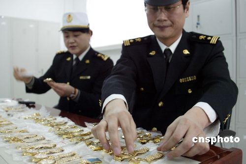 3月5日,遼寧丹東海關在公路口岸監管進出境旅客時,從朝鮮入境的兩名中國旅客隨身攜帶的包裹中查獲涉嫌侵犯知識產權的手表共計88塊,包括勞力士、雷達、浪琴等六種世界知名品牌。這是丹東海關自開展知識產權海關保護工作中查獲的最大一起涉嫌案件。中新社發 陳浩浩 攝