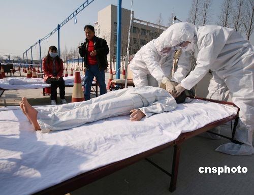 3月5日,安徽蒙城縣舉行人禽流感防治應急處置演練,從縣衛生醫療機構抽調的有關人員分別參加了人員防護著裝與卸裝、病人就診、疫情報告、醫療救治、院內疫情流調防控及病人救治、病人居住地疫情防控、應急處置等七個部分的實地演練。據悉,演練旨在檢驗人禽流感防治預案的可操作性和執行效果,測試醫療衛生機構衛生應急及醫療救助能力,提高全縣應對突發公共衛生事件應急處置能力。中新社發 胡衛國 攝