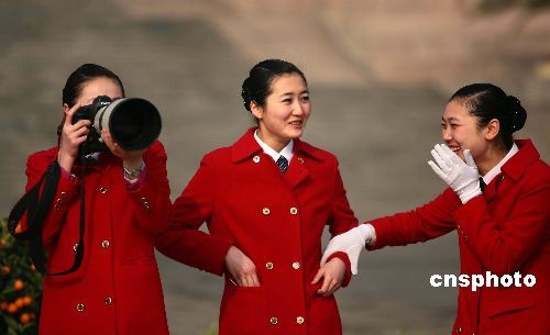 三月十日上午,十一屆全國人大一次會議在北京人民大會堂舉行第三次全體會議,三名兩會女服務人員在會場外好奇試用攝影記者的重“武器”。中新社發 盛佳鵬 攝