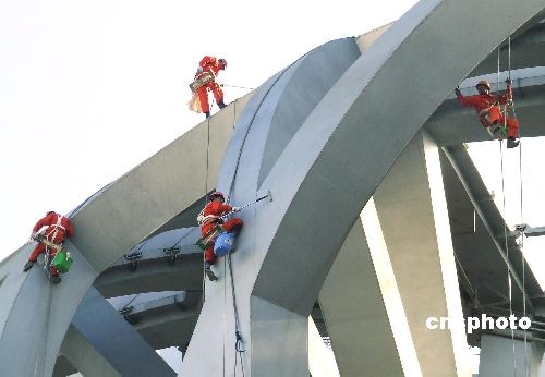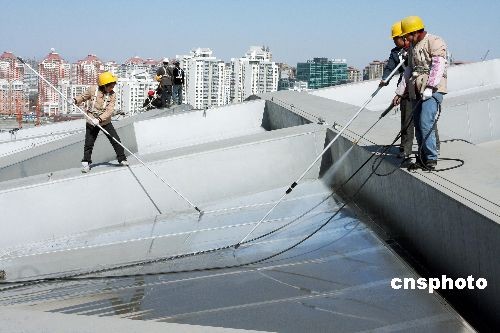 3月13日,中國國家體育場“鳥巢”開始“洗臉美容”。據北京城建集團國家體育場工程總承包部消息,此次清洗是為了迎接4月中旬的“好運北京”測試賽。“鳥巢”膜結構近92000平方米,在膜結構清洗的同時還進行鋼結構保潔。圖為工作人員正在對“鳥巢”進行鋼結構保潔。中新社發 鄭雄增 攝