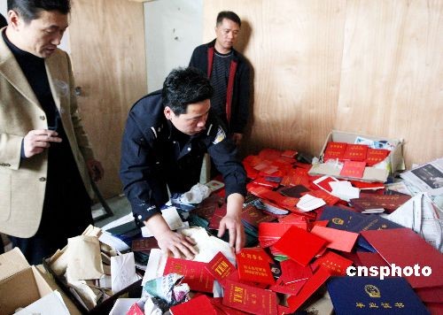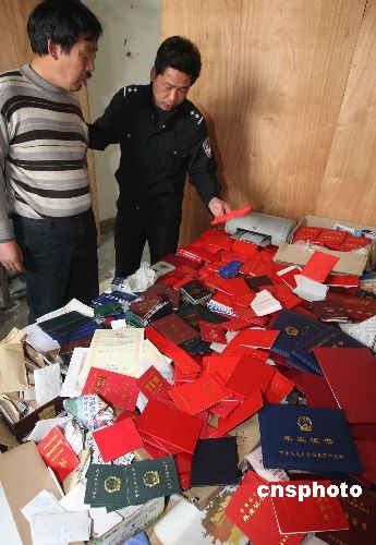 3月19日,河南洛陽警方在一民宅內將一伙制造假證的犯罪集團逮個正著。行動中查獲各類假證7大類145種共計10000多份,現場還查獲印章、鋼印、電腦、打印機等一批制假造假設備。在事實面前,犯罪嫌疑人對犯罪事實供認不諱。中新社發 曾憲平 攝