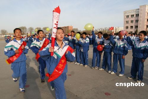 3月24日,為慶祝北京奧運圣火在希臘采集,新疆哈密市六中舉辦了“傳遞火炬 點燃激情”為主題的體驗奧運火炬傳遞活動,千余名學生參加了體驗傳遞奧運火炬活動。中新社發 普拉提 攝