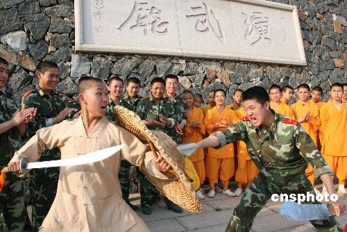 4月6日,武警福建泉州支隊四中隊官兵們與駐地南少林武僧進行了一場“武林爭霸”賽活動。通過活動,官兵們既增加了對中國傳統(tǒng)少林文化的認識了解,也激發(fā)了愛警習武、苦練軍事技能本領(lǐng)的決心。圖為武警戰(zhàn)士與少林武僧“切磋”功夫的情景。中新社發(fā) 張九強 攝