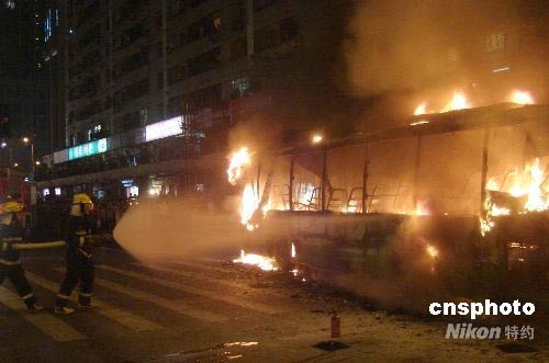 四月九日晚二十一時三十分許,重慶市區一輛載有十余名乘客的公交車在行進中起火燃燒。消防人員迅速趕到現場撲救,由于乘客疏散及時,未造成人員傷亡。出事公交車燒得面目全非,起火原因在進一步調查中。中新社發 萬明 攝