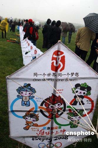 4月21日,第25屆濰坊國際風(fēng)箏會在山東濰坊浮煙山國際風(fēng)箏放飛場舉行萬人放飛風(fēng)箏喜迎奧運活動。當(dāng)日下著雨,但是參加活動的放飛者和觀眾依然熱情不減,盡顯世界風(fēng)箏之都——濰坊的魅力。圖為濰坊十三中學(xué)生手繪的由300多幅,208米長的迎奧運巨型風(fēng)箏格外引人注目。作者: 趙雋