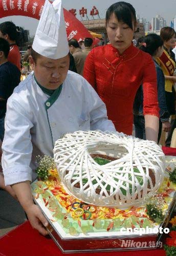 2000年4月24日,北京中央電視塔廣場,第六屆中關村國際美食節(jié)開幕式在此隆重開幕。飲食企業(yè)和社團派出精兵強將,在“綠色餐飲.奧運美食”流行經典菜式的展示活動中展示自家拿手的菜肴。圖為一家餐廳展示制作精良的美食制品《鳥巢》。中新社發(fā) 鄒憲 攝