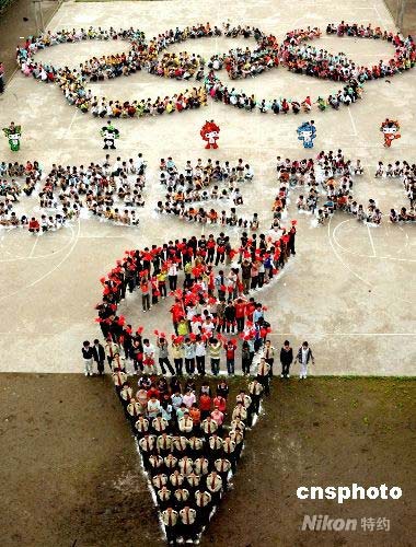 4月28日下午,四川省華鎣市古橋初中、華鎣市職業(yè)中學(xué)、華鎣市國家稅務(wù)局等部門的1500多名學(xué)生、教職員工,一起組成“祝奧運(yùn)成功”五個(gè)大字及火炬、五環(huán)、福娃等奧運(yùn)圖案,迎接北京奧運(yùn)會(huì)倒計(jì)時(shí)100天的到來。 中新社發(fā) 邱海鷹 攝