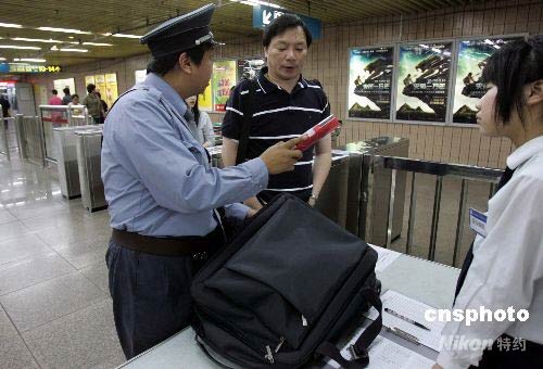 5月10日上午,在上海徐家匯地鐵站的安全檢查通道,一乘客因攜帶危險物品被勸說退票。從今天起,上海軌道交通所有車站開辟專用安全檢查通道,由專人全天候逐一對乘客攜帶的箱包進行安全檢查,據了解,從4月15日至今,上海軌交查堵危險品1200余件。主要有液化氣鋼瓶、煙花、油漆、裝修膠水等,其中,依法對700余名違法攜帶危險物品的人員依法做出行政處罰。中新社發 潘索菲 攝