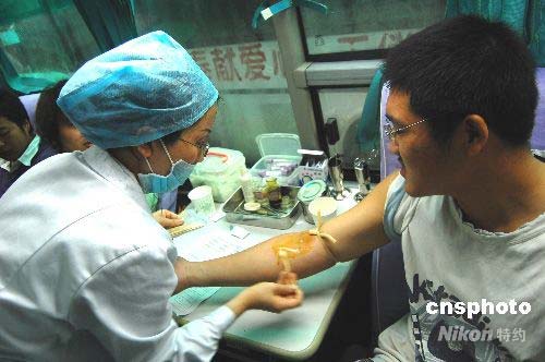 5月14日,重慶市西南大學(xué)育才學(xué)院近500名同學(xué)冒著大雨排隊(duì)獻(xiàn)血。重慶市合川區(qū)血液中心來到校園進(jìn)行采集血液,引起了大量學(xué)生的踴躍報(bào)名獻(xiàn)血,場面一度失控。同學(xué)們血脈相通汶川,紛紛表示了對(duì)災(zāi)區(qū)人民的慰問之情。血液中心負(fù)責(zé)人介紹說,當(dāng)天采集了200余名學(xué)生的血液,將馬上運(yùn)送到最需要的災(zāi)區(qū)。中新社發(fā) 許康平 攝