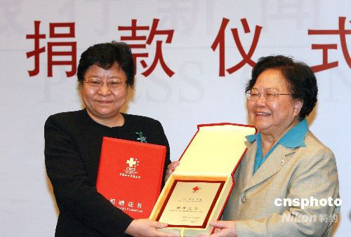5月14日,中國銀行在北京舉行捐贈儀式,向中國紅十字總會捐款1000萬元人民幣,用于汶川地震災區援救工作。中國銀行副行長張燕玲(左)接受捐款證書并在發布會上介紹:中國銀行各一級分行、直屬分行已為此次抗震救災開啟緊急“綠色通道”,免除全部捐款的匯款手續費。中新社發 廖文靜 攝