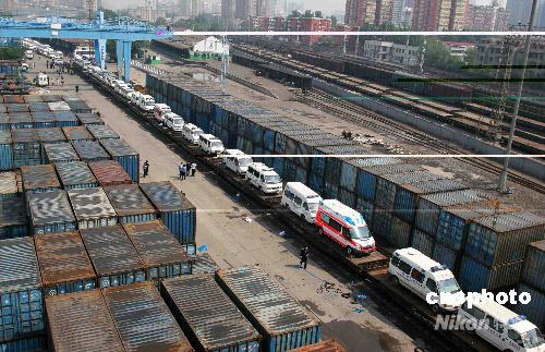 5月15日,由北京市衛(wèi)生局組織的70輛救護車和3輛指揮車,滿載救災物資從北京廣安門火車站駛出,奔赴四川地震災區(qū)。中新社發(fā) 富田 攝