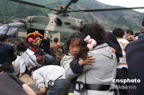 5月14日,軍用直升機降落四川汶川縣映秀鎮(zhèn)搶救災民。圖為母親急著要把受傷的女兒送上飛機到達安全地點。中新社發(fā) 黃榮 攝