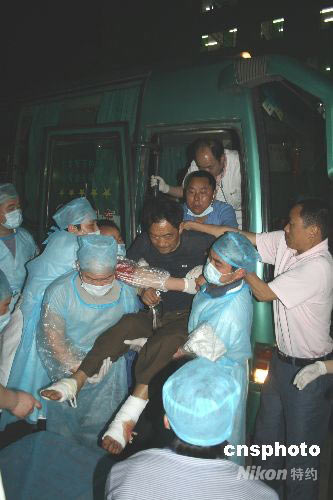 5月15日23時,又一批90名從地震重災(zāi)區(qū)四川綿竹市的傷員,被連夜運(yùn)到眉山市第二人民醫(yī)院,當(dāng)?shù)蒯t(yī)務(wù)人員、青年志愿者和剛剛趕到這里增援的吉林省醫(yī)療隊等數(shù)百人齊心協(xié)力,經(jīng)過1個小時的奮斗后把這批傷員安置到病房,并立即展開救治。中新社發(fā) 堯遙 攝