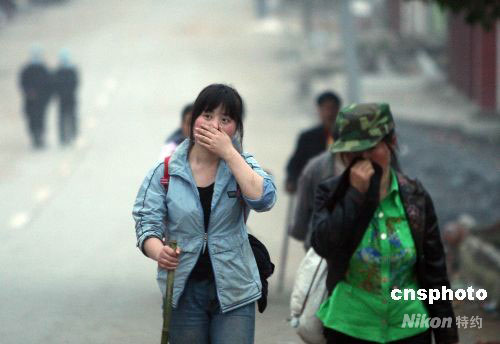 5月15日晚,幾名在距離紅白鎮鎮街幾十公里的西部神奇歡樂谷景區工作的人員步行逃出山區。12日發生的汶川大地震波及四川省德陽市下轄的什邡市(縣級市)的多個鄉鎮,紅白鎮與外界交通、通訊被完全阻斷。15日下午16時許,外界到紅白鎮鎮街的道路被打通。中新社發 郭晉嘉 攝